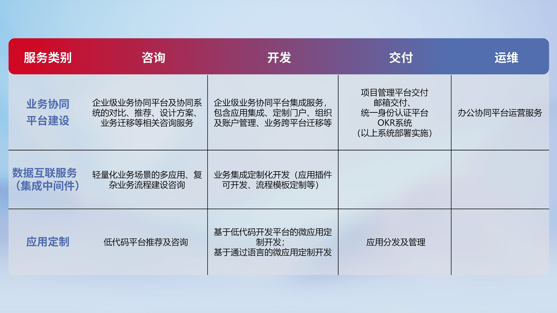 针对钉钉、、、、企微、、、、IDaas等平台级产品提供产品的规划、、、方案、、交付、、、定制化开发等服务,,,,实现如统一协同办公、、智能客户服务、、、混合会议管理、、、、智能数据查询、、等业务场景,,,实现数字化转型。。
