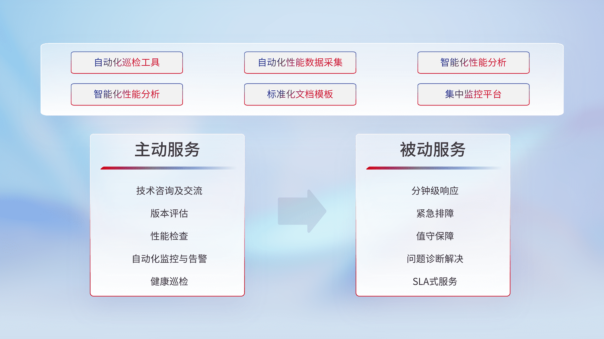 智能化工具和标准化文档,,保障服务质量,,提供主动服务(包含技术咨询、、、、版本评估、、、性能检查、、、、自动化监控与告警、、、健康巡检)和被动服务包含(分钟级响应、、紧急排障、、、、值守保障、、、、问题诊断解决、、、、SLA服务)。。。。
